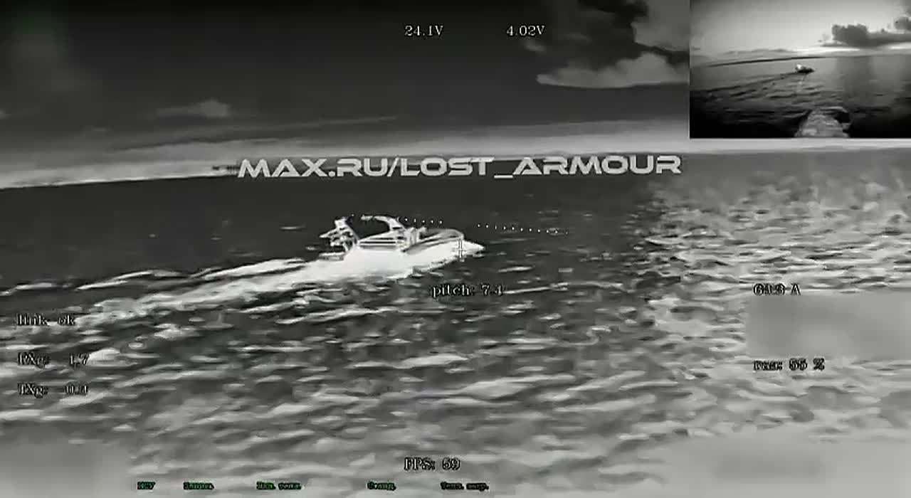 Дрон на оптоволокне поражает украинский бекипажный катер с зенитными ракетами в Черном море.Военкор Владимир Разин @razin_ZOV