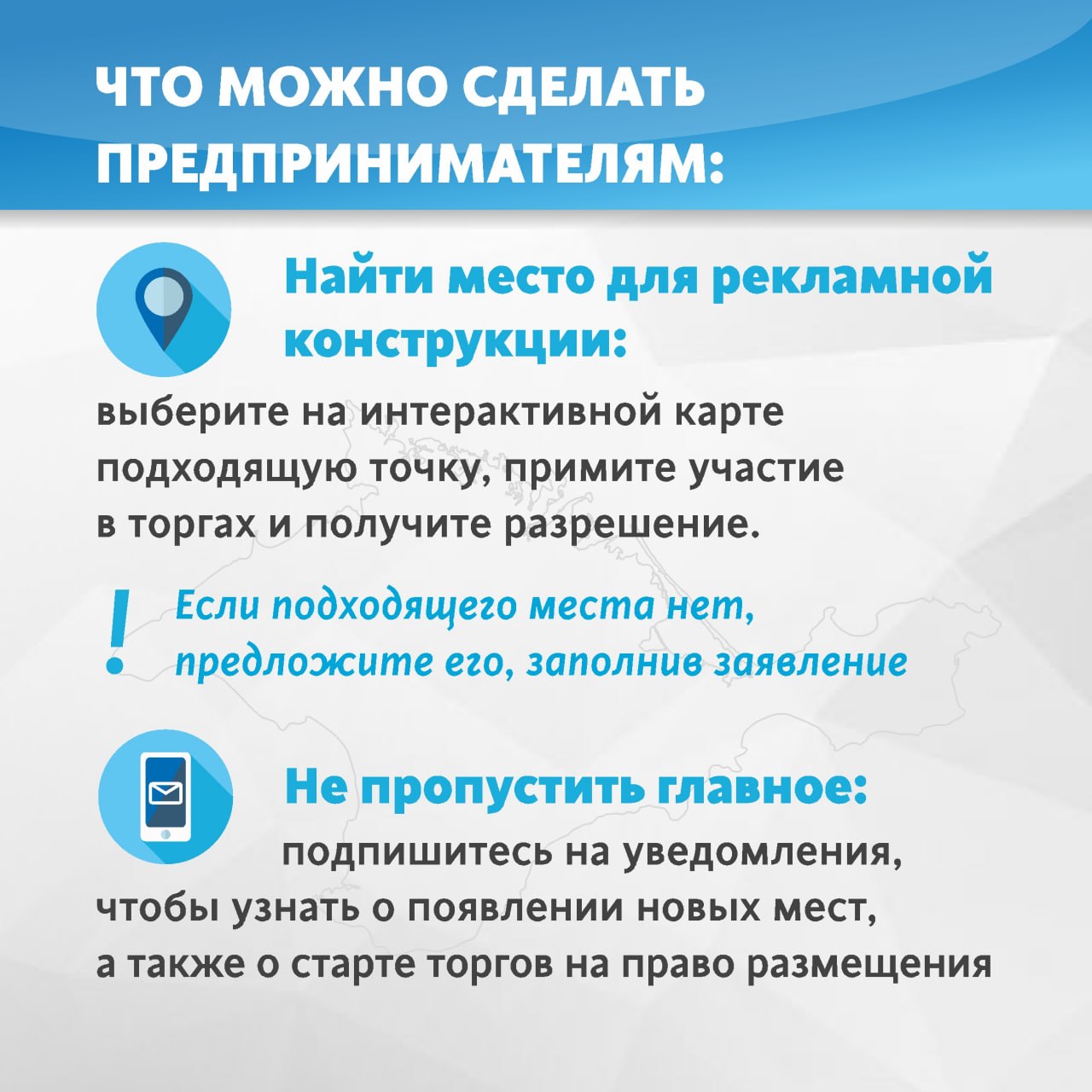 Теперь предпринимателям доступна возможность найти место для рекламной конструкции: выберите на интерактивной карте подходящую точку, примите участие в торгах и получите разрешение. Если подходящего места нет, предложите его, заполнив заявление.