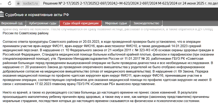 Кроме того, Царьград внимательно ознакомился с постановлением суда от 2025 года, где сказано, что "в нарушение ст. 69 Закона, Порядка оказания медицинской помощи по профилю "детская хирургия" врач-хирург ФИО11, врач-хирург ФИО16, принимавшие участие в проведении операции, соответствующих сертификатов для оказания медицинской помощи по профилю "детская хирургия" не имеют".