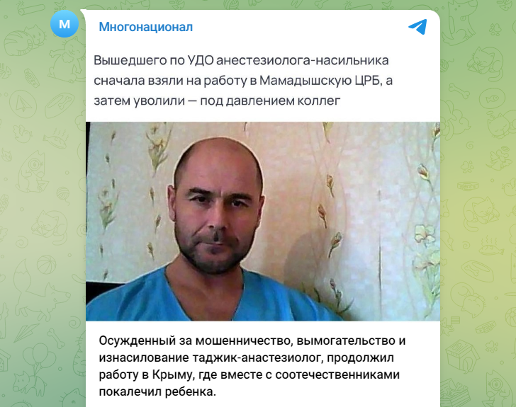 Дефицит кадров в наших больницах не повод, чтобы брать на работу кого попало? Пример таджикского "доктора" Зиёделло Носирова показывает обратное. Осуждённый за мошенничество, вымогательство, а также изнасилование таджик-анестезиолог продолжил работу в Крыму. И там же вместе с соотечественниками покалечил ребёнка.
