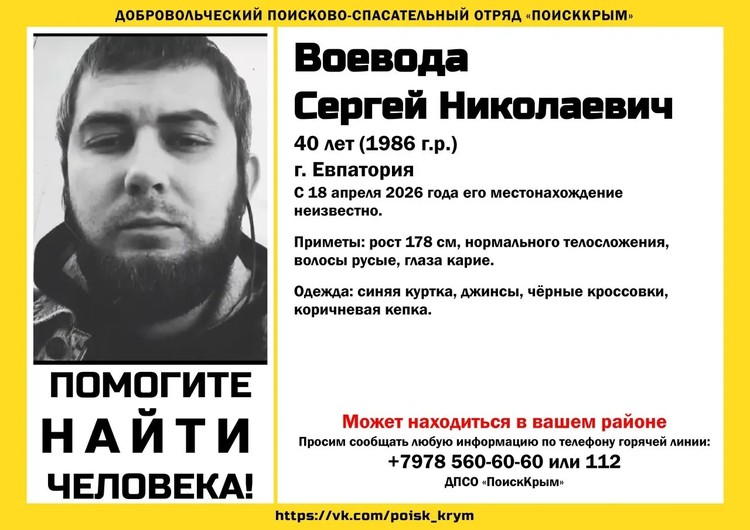 «Пропал Воевода Сергей Николаевич, 40 лет (1986 год рождения), город Евпатория».