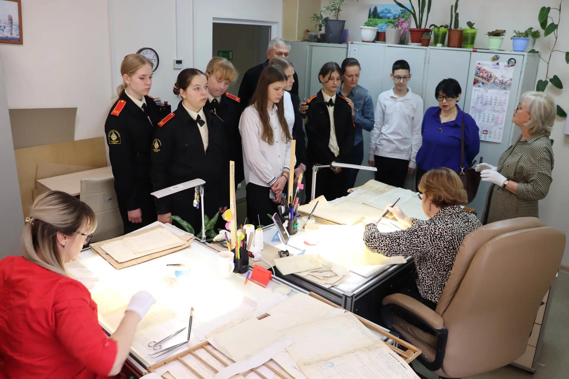 В ходе знакомства с деятельностью Госархива ребята узнали о деятельности крымских архивистов на протяжении 107-летней истории с начала его работы, становлении архивной системы полуострова, условиях хранения исторических документов, выполнении важных архивных задач по комплектованию архива, обеспечению сохранности, учету, использованию и популяризации архивных документов. Школьники побывали в архивохранилище, смогли проучаствовать в оцифровке архивных документов, узнали о работе с электронным фондом пользования в читальном зале, правилах работы читальных залов Госархива, возможностях изучения истории своей семьи, рода, понаблюдали за реставрацией архивных дел, ознакомились с архивным каталогом, получили представление об электронных базах данных, поговорили об использовании архивных документов при подготовке работ для проводимого Государственным комитетом по делам архивов Республики Крым конкурса «Судьба моей семьи в судьбе моей страны».