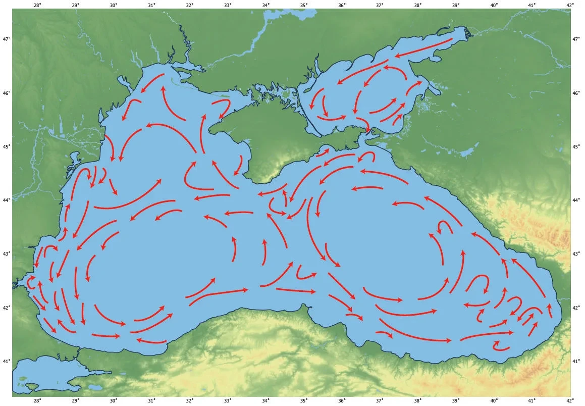 10 000 квадратных метров. Можно ожидать, чтоИсходя из карты течений можно ожидать дрейфа к побережью Крыма + что-то скорее всего и до побережья Турции дойдет.