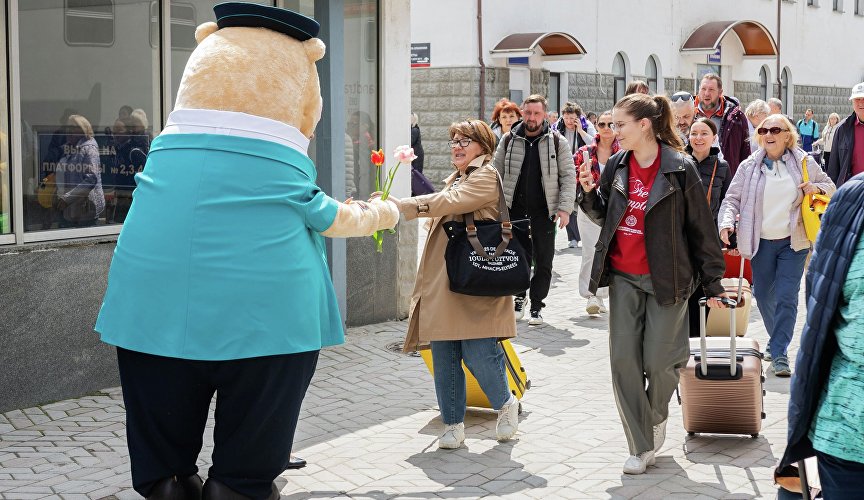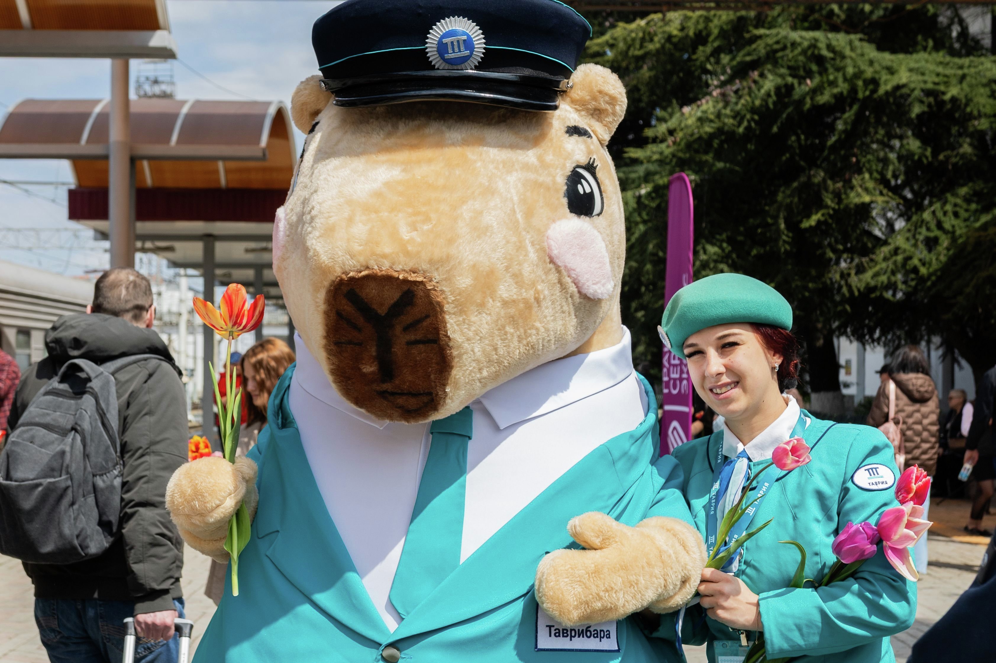 Сегодня на ж/д вокзале крымской столицы гостей полуострова встречали сотрудники Туристско-информационного центра Крыма и талисман поездов «Таврия» – народный проводник Таврибара. В честь завершения 19-го парада тюльпанов в Никитском ботсаду «Романтика Крымской весны» здесь организовали «Цветочную встречу». Каждой даме, вышедшей на перрон из прибывших поездов, дарили яркого представителя семейства лилейных, выросшего под небом Ялты на знаменитой выставочной экспозиции, созданной руками крымских селекционеров.