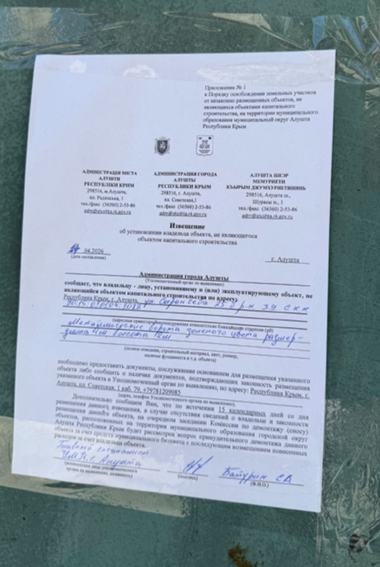 Дополнительно сообщаем Вам, что по истечении 15 календарных дней со дня размещения данного извещения, в случае отсутствия сведений о владельце и законности размещения данных объектов, на очередном заседании Комиссии по демонтажу (сносу) объектов, расположенных на территории муниципального образования муниципальный округ Алушта Республики Крым будет рассмотрен вопрос принудительного демонтажа данных объектов за счет средств муниципального бюджета с последующим возмещением понесенных расходов за счет владельца объектов.
