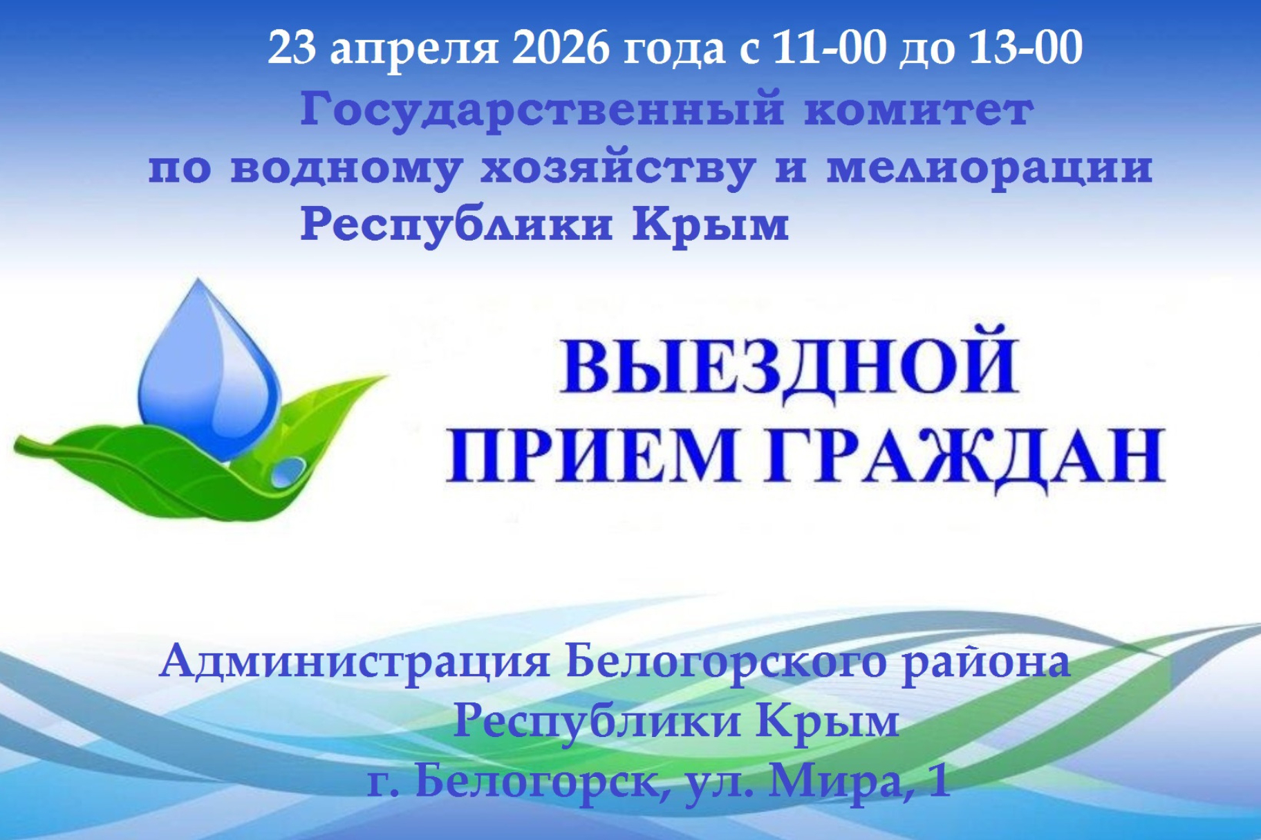 Открыта предварительная запись на личный выездной прием граждан руководством Государственного комитета по водному хозяйству и мелиорации Республики Крым. Приём граждан состоится 23 апреля 2026 года.