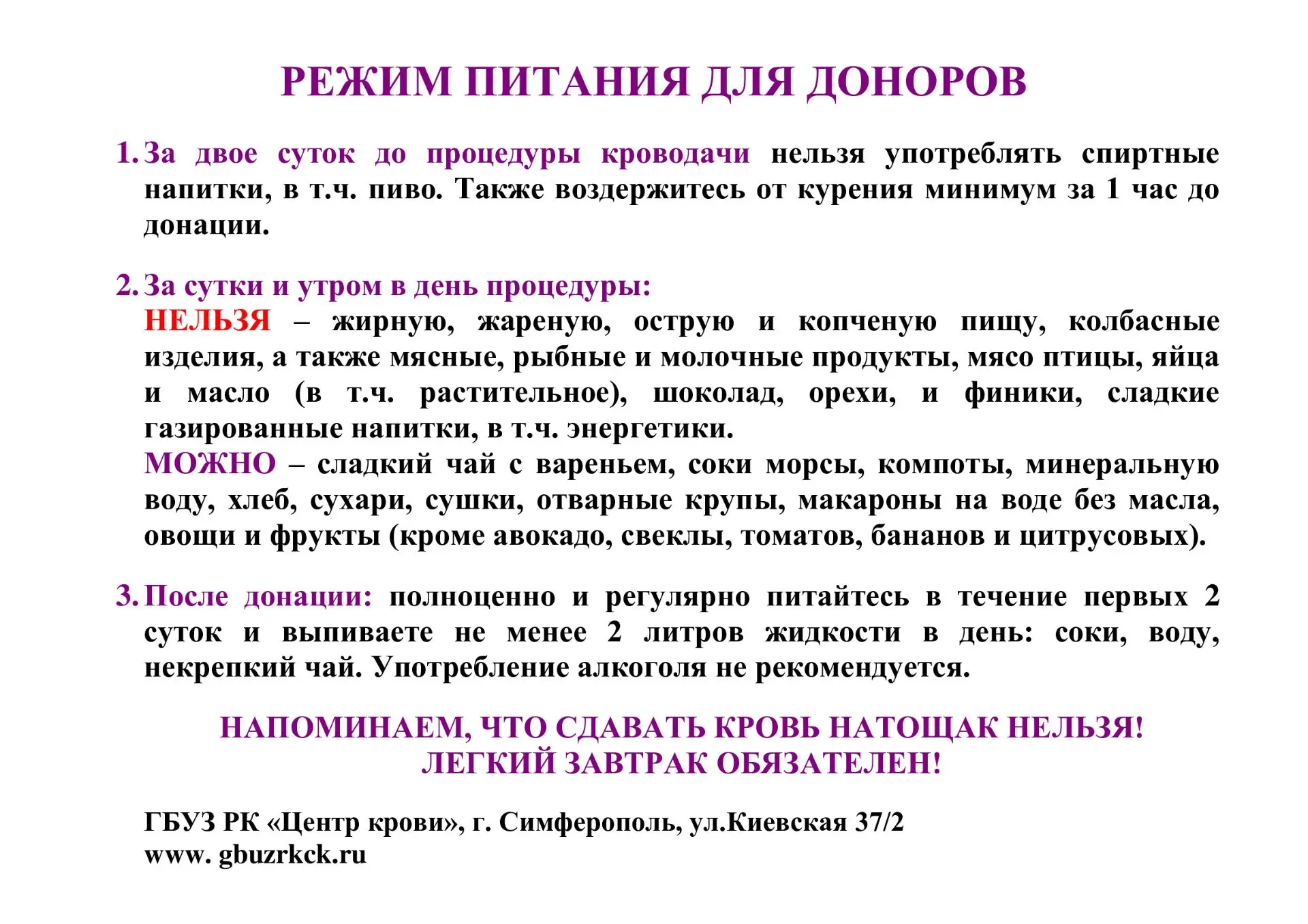 Донорам крови рекомендуется ознакомиться с режимом питания (файл прикреплен к публикации).