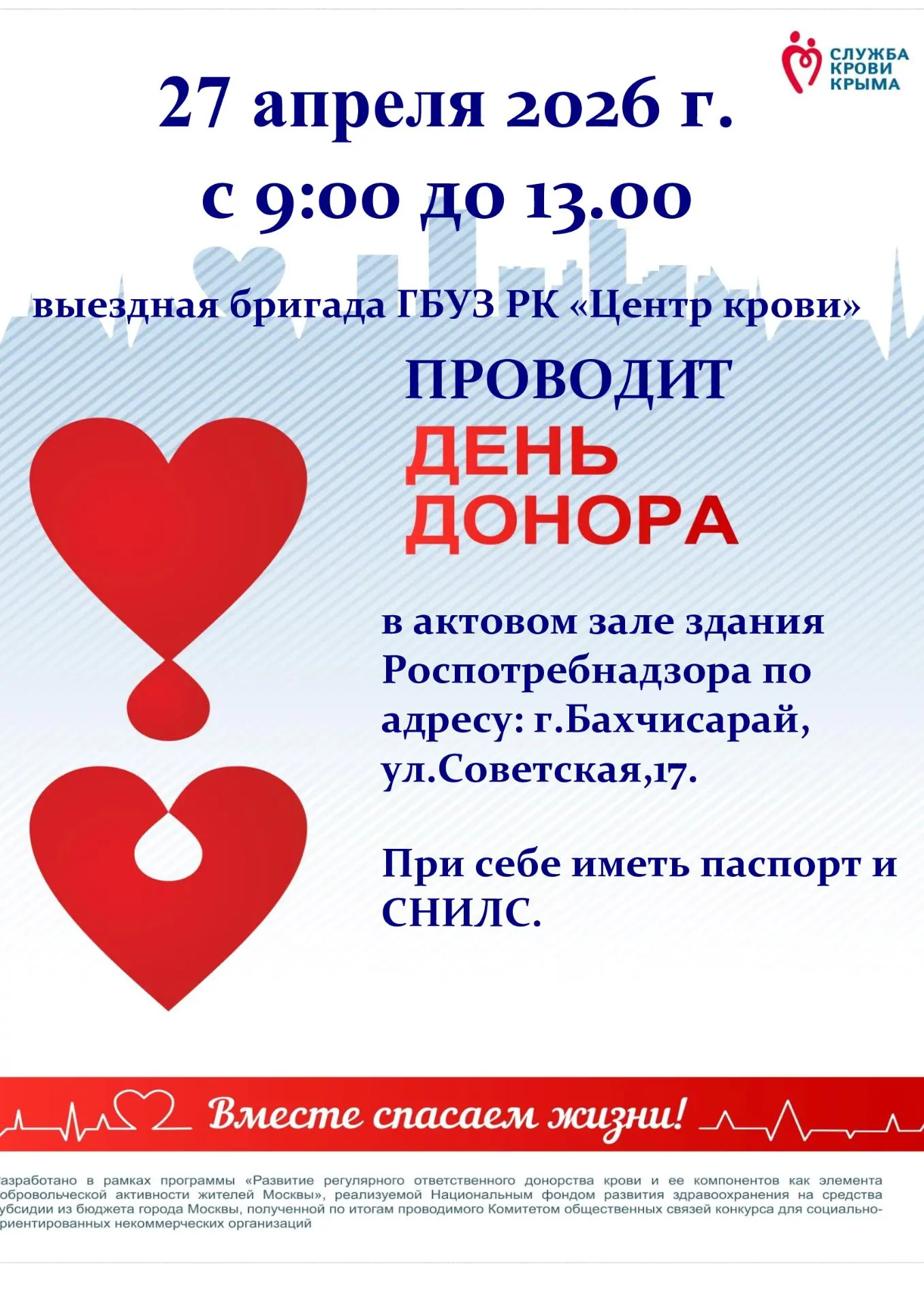 27 апреля 2026 года с 9.00 до 13.00 выездная бригада ГБУЗ РК «Центр крови» проведет «День донора» в актовом зале здания Роспотребнадзора по адресу: г.Бахчисарай, ул.Советская, 17.