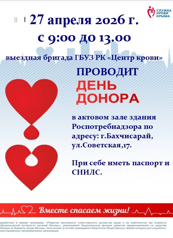 27 апреля 2026 года с 9.00 до 13.00 выездная бригада ГБУЗ РК «Центр крови» проводит День донора в актовом зале здания Роспотребнадзора по адресу: г.Бахчисарай, ул.Советская,17.