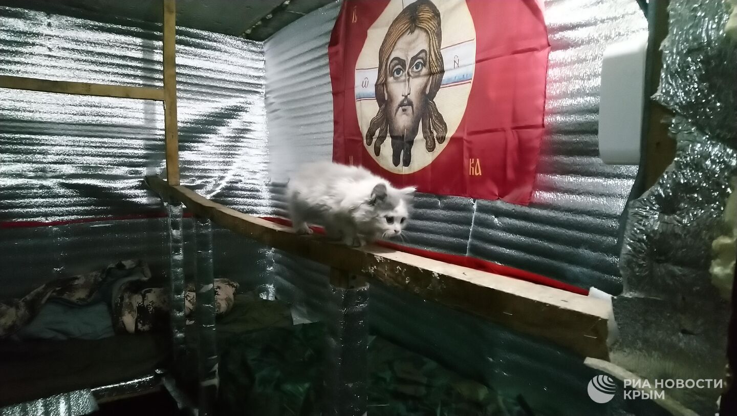 Быт у Бобра организован строго по-солдатски: кухня, две спальные комнаты, удобные лежаки, все вещи на своем месте. В меру чисто и по-домашнему комфортно. Волонтеров встречает маленький пушистый комочек – кошка по кличке Вата. Ей два месяца, привезли товарищи в крохотной коробке. Бобер ее отмыл, приучил к лотку и оставил нести службу на "своих подпольных" позициях - гонять мышей и радовать глаз.