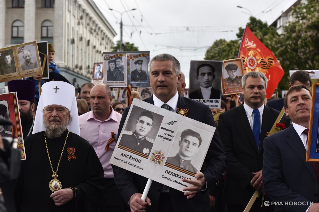 Глава Республики Крым Сергей Аксенов (в центре) и митрополит Симферопольский и Крымский Лазарь (слева) на акции "Бессмертный полк" в Симферополе.