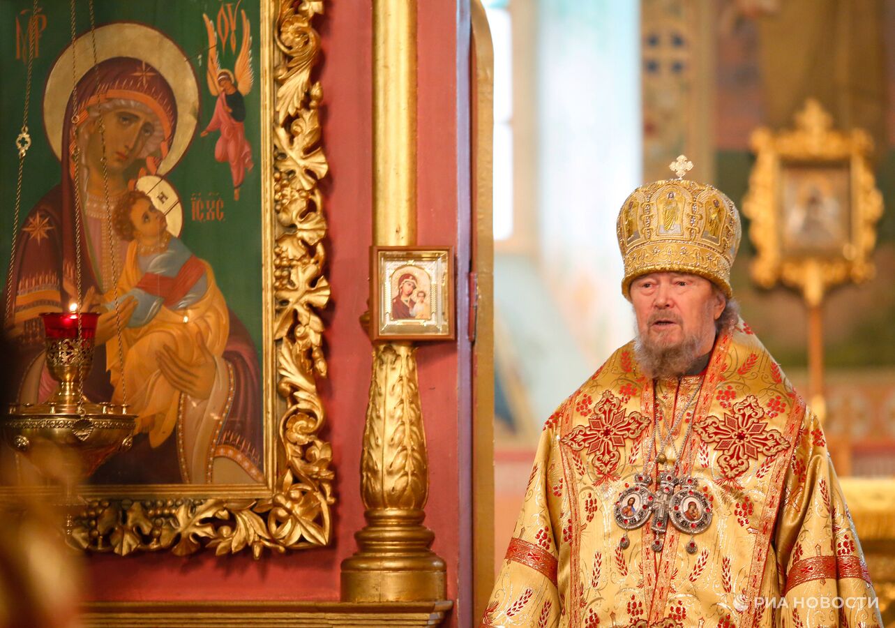 Митрополит Симферопольский и Крымский Лазарь во время "детской" Божественной Литургии в Петро-Павловском кафедральном соборе Симферополя.