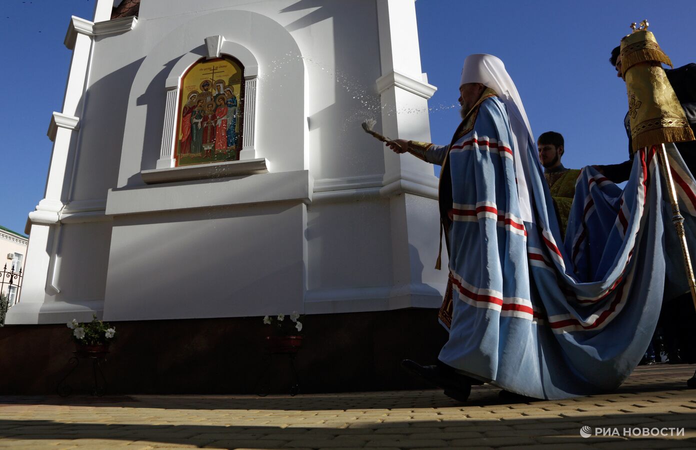 Митрополит Симферопольский и Крымский Лазарь на открытии часовни в честь святых царственных страстотерпцев государя Николая II и его семьи у здания крымской прокуратуры в Симферополе.