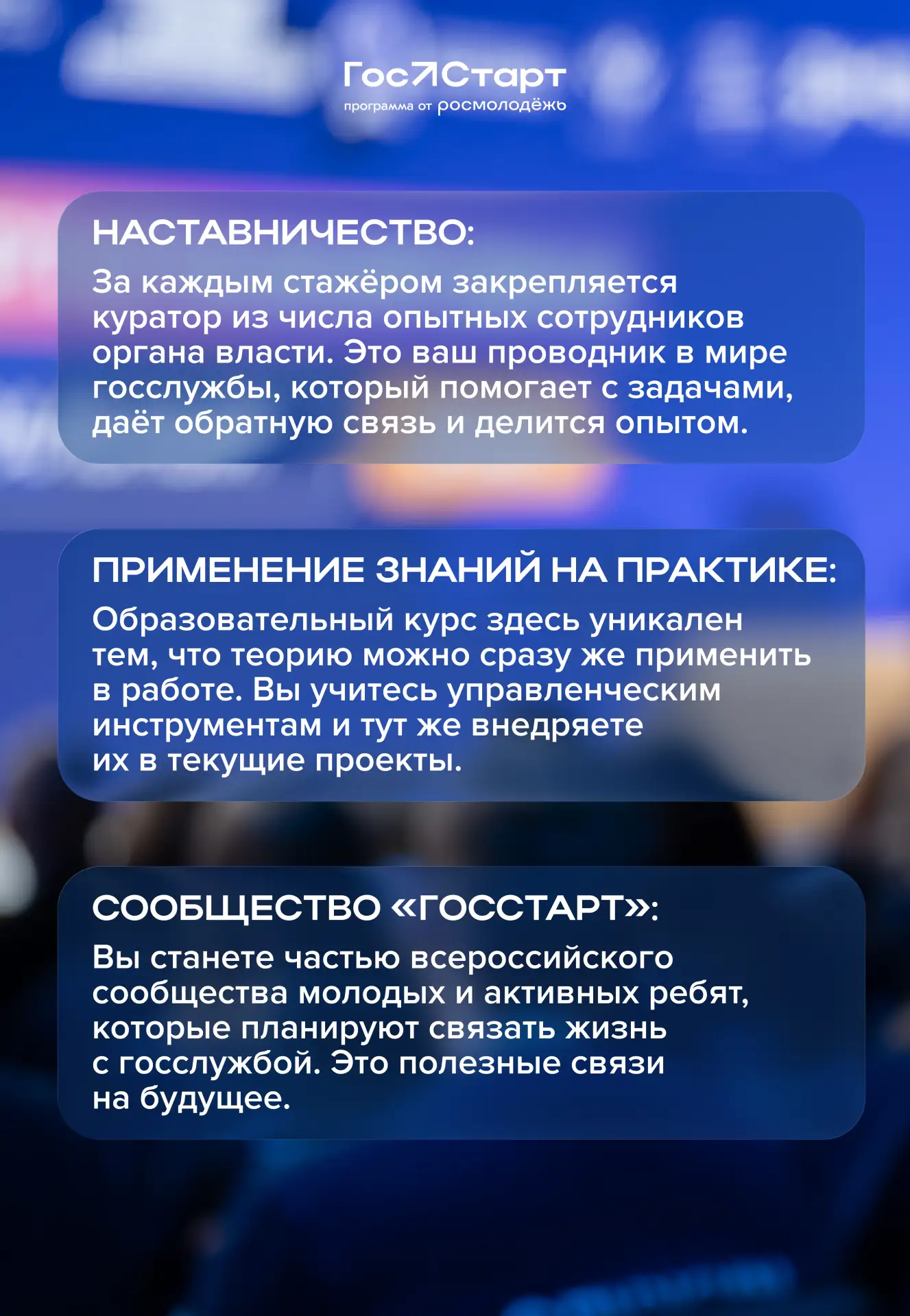 За каждым стажёром закрепят наставника из числа опытных сотрудников ведомства. Он поможет с задачами, даст обратную связь и станет проводником в мире госслужбы.
