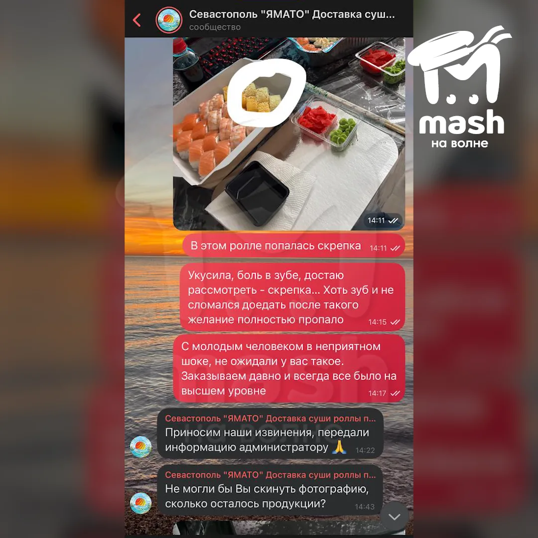Обедаете? Вот вам история к столу. Клиентка получила ролл с металлической скобкой из севастопольской доставки "Ямато".