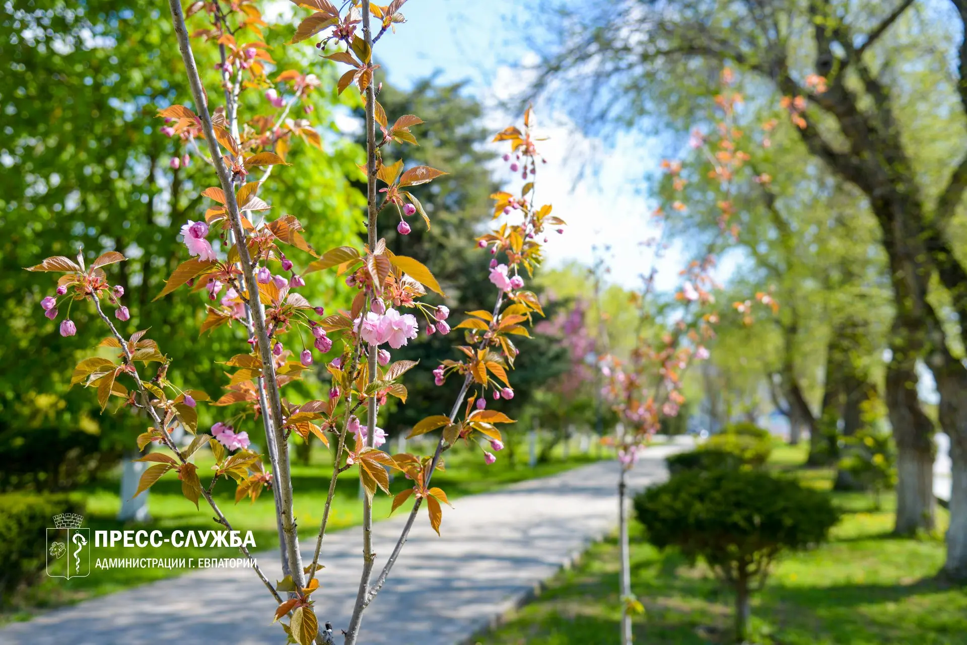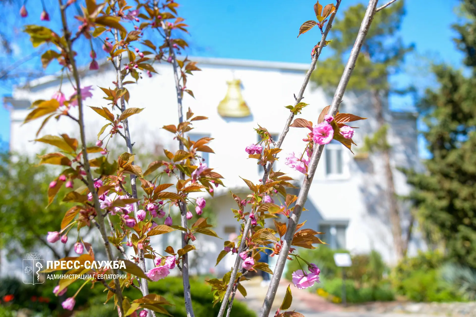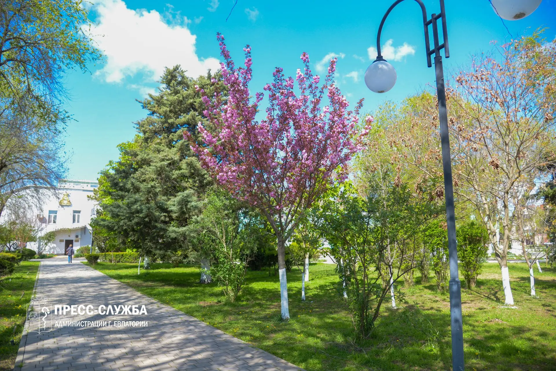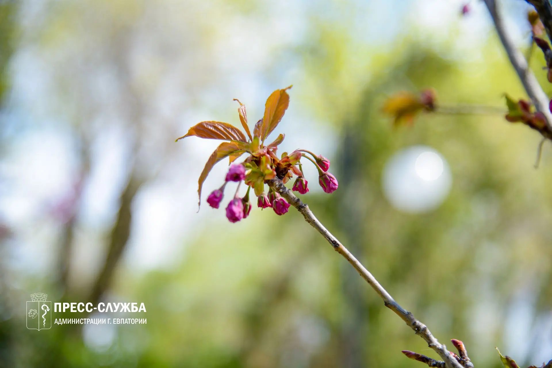 ФОТОФАКТ: В Евпатории можно полюбоваться цветением сакуры. Японская декоративная вишня распустилась в сквере Памяти героев Чернобыля.