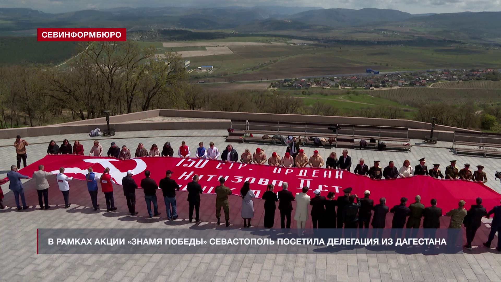 Из Дагестана в Севастополь привезли футляр с копией Знамени Победы. Участники митинга развернули гигантское полотнище на площади перед зданием Диорамы, где теперь оно будет храниться.