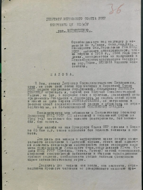 «…К Вам, своему Депутату Социалистического Парламента, тому, за кого свой голос при выборах в Верховный Совет УССР отдали трудящиеся гор. Винницы, большевику ЛЕНИНЦУ- СТАЛИНЦУ, обращаюсь я, верный сын Могучей Социалистической Родины, не раз, в открытых боях с врагами, доказавший свою преданность Революции и готовность не щадить своей крови и жизни за дело Партии ЛЕНИНА–СТАЛИНА, за могущество и расцвет своей социалистической родины, – обращаюсь за справедливостью, за большевистской СТАЛИНСКОЙ ПРАВДОЙ.