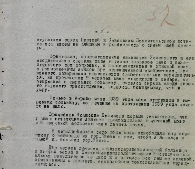 Двадцать два месяца в непрерывных муках своего томительного заключения в Киевской тюрьме, стены моей одиночки являлись свидетелями неслыханного ужаса творимого надо мной оперуполномоченными Успенского бывш. сотрудниками VI-го Отдела НКВД УССР (Грабарь, Коган, Ратнер), в результате гнусной провокации, зверскими смертельными избиениями и пытками переходившими границы садизма, свойственные только палачам фашистских тюрем капиталистических стран.