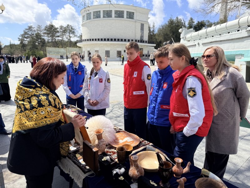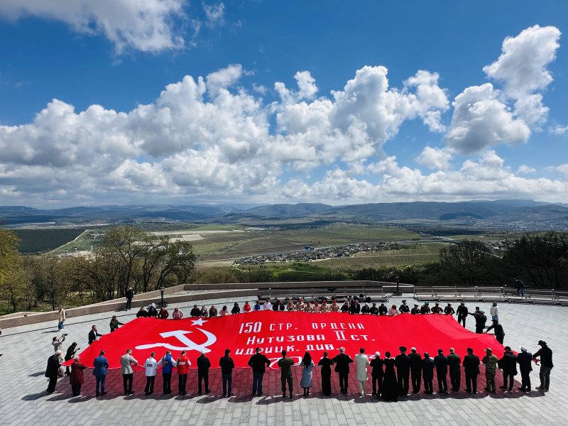 Сегодня на Сапун-горе прошла церемония развертывания большой копии Знамени Победы — алого полотна штурмового флага 150-й ордена Кутузова II степени Идрицкой стрелковой дивизии. Здесь же установили стенды с изделиями дагестанских мастеров.