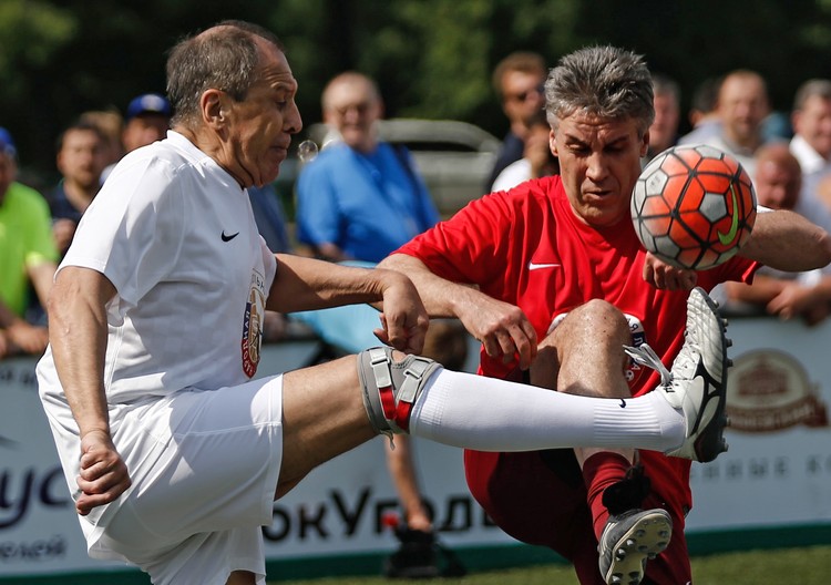 Министр иностранных дел РФ Сергей Лавров и Алексей Пиманов на гала-матче Народной футбольной лиги, 2016 год.Фото: Александр Щербак/ТАСС