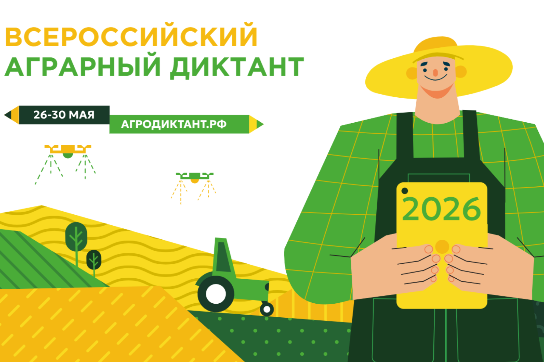С 26 по 30 мая 2026 года в России во второй раз пройдет Всероссийский агродиктант – федеральная акция по проверке знаний об агропромышленном комплексе, сельских территориях и продовольственной безопасности страны. Регистрация участников и площадок уже доступна на сайте агродиктант.рф. Торжественная церемония открытия состоится в Москве, в Национальном центре «Россия», в рамках Форума тружеников села.