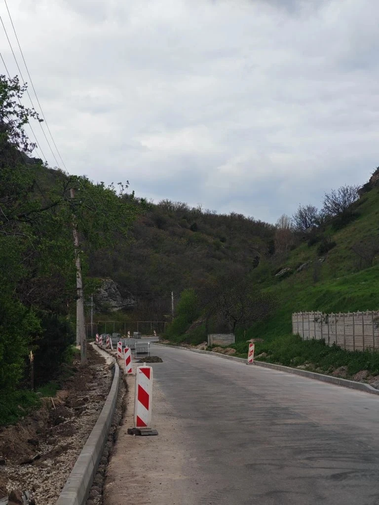 В поселке Щебетовка дорожники устанавливают бордюры. Работы идут по нацпроекту «Инфраструктура для жизни», заказчик — ГКУ РК «Служба автодорог Крыма».