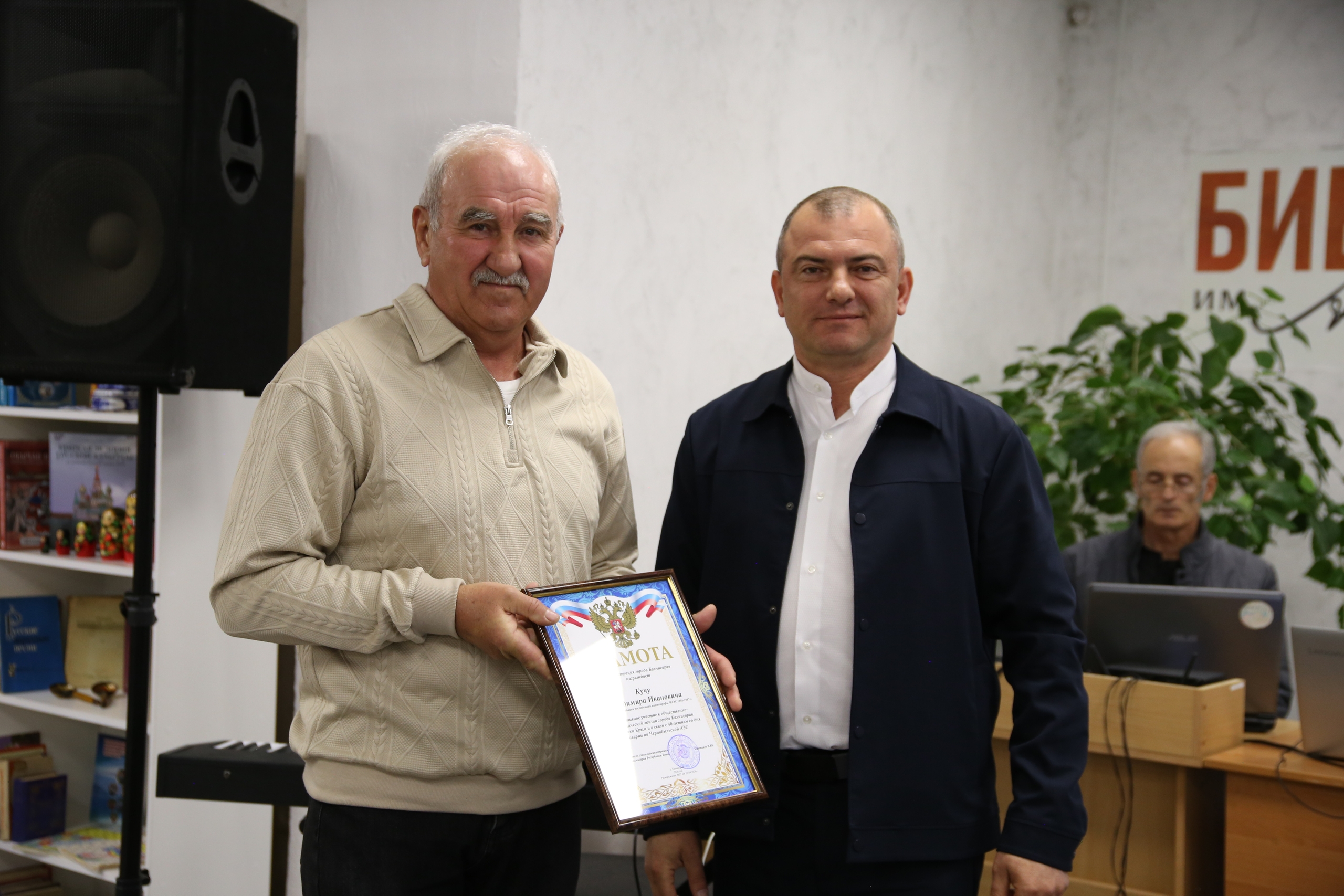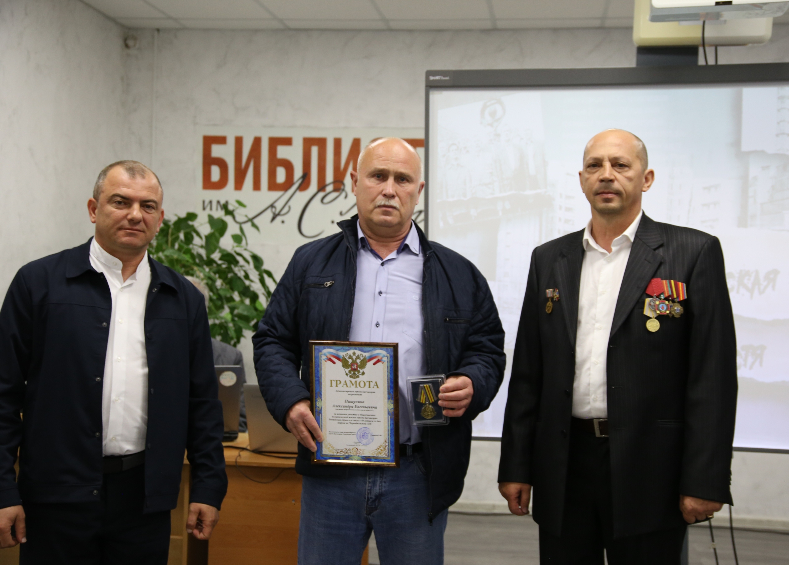 В ходе встречи участники тех трагических событий были отмечены грамотами администраций и советов. Исполняющий обязанности председателя Отделения РООИ «Союз Чернобыль» по Бахчисарайскому району Олег Тихомиров вручил нагрудный знак «Подразделения особого риска» нашему земляку, бахчисарайцу – Александру Пищулину.