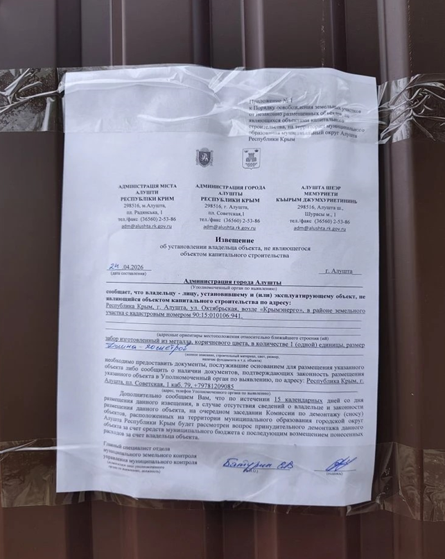 Администрация города Алушты Республики Крым сообщает о незаконно размещенном объекте, не являющийся объектом капитального строительства, на территории муниципального образования муниципальный округ Алушта Республики Крым, по следующему адресу:Республика Крым, г. Алушта, ул. Октябрьская, возле «Крымэнерго», в районе з.у. с к.н. 90:15:010106:941
