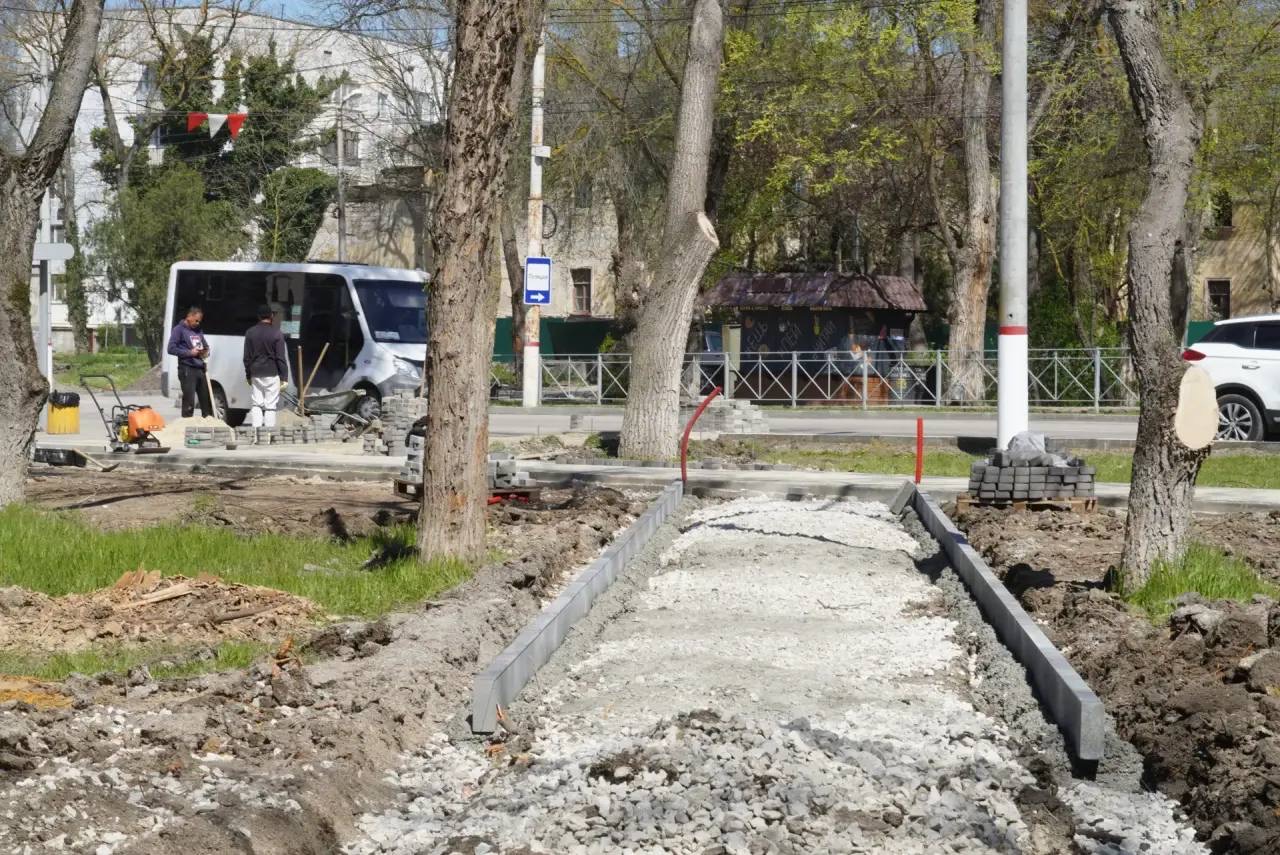 Специалисты работают и в выходной день. Выполнено около 70% всех запланированных работ. Завершается укладка плитки на участке вдоль памятника, продолжается монтаж садовых бордюров. Строители активно ведут благоустройство и на противоположной стороне за остановкой.