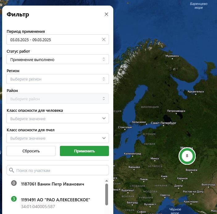 Для поиска по интересующим пользователя заданным параметрам требуется ввести необходимые критерии поискового запроса в соответствующие атрибутивные поля информационного блока фильтров и использовать кнопку «Применить» (Рисунок 5). Для отображения исторических данных пользователю требуется выбрать необходимый период, после применения выбранных фильтров на карте отобразятся планы, удовлетворяющие критериям поиска.
