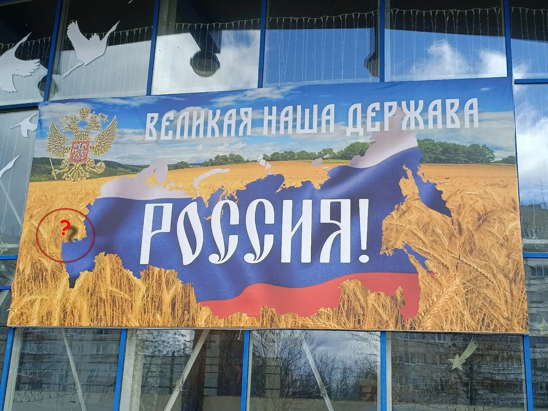 «На баннере изображены символические очертания России, не претендующие на географическую точность (можно заметить, что на нём нет и Калининграда). Он на протяжении многих лет вывешивается в качестве украшения к майским праздникам.