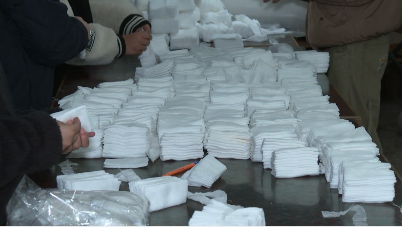 Организация в селе Трудовом разместилась на территории храма Спиридона Тримифунтского. Сюда доставляют рулоны ткани, её нарезают для изготовления маскировочных сетей, хирургических салфеток и других расходных материалов.