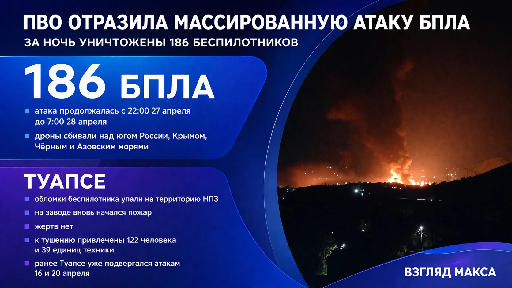 Одной из целей атаки стал Туапсе. По предварительным данным, в результате падения обломков одного из украинских беспилотников на территории нефтеперерабатывающего завода вновь начался пожар.