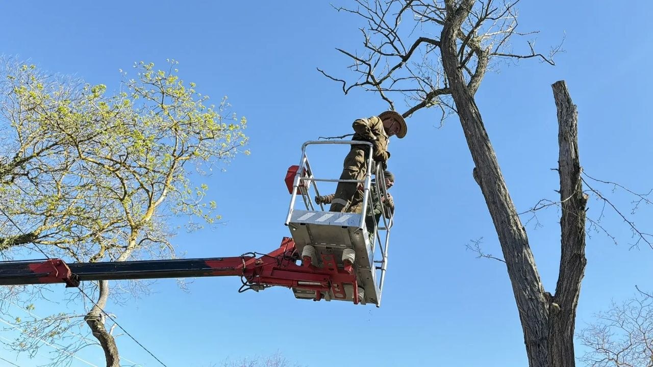 Ежедневно сотрудники Службы городского хозяйства ведут работы по уходу за зелеными насаждениями. Сегодня бригада пильщиков работает во дворе по ул. Войкова, 20 — кронируют деревья, выполняют снос сухих растений. Используют высоторезы и пилы, а в труднодоступных местах применяют вышку.