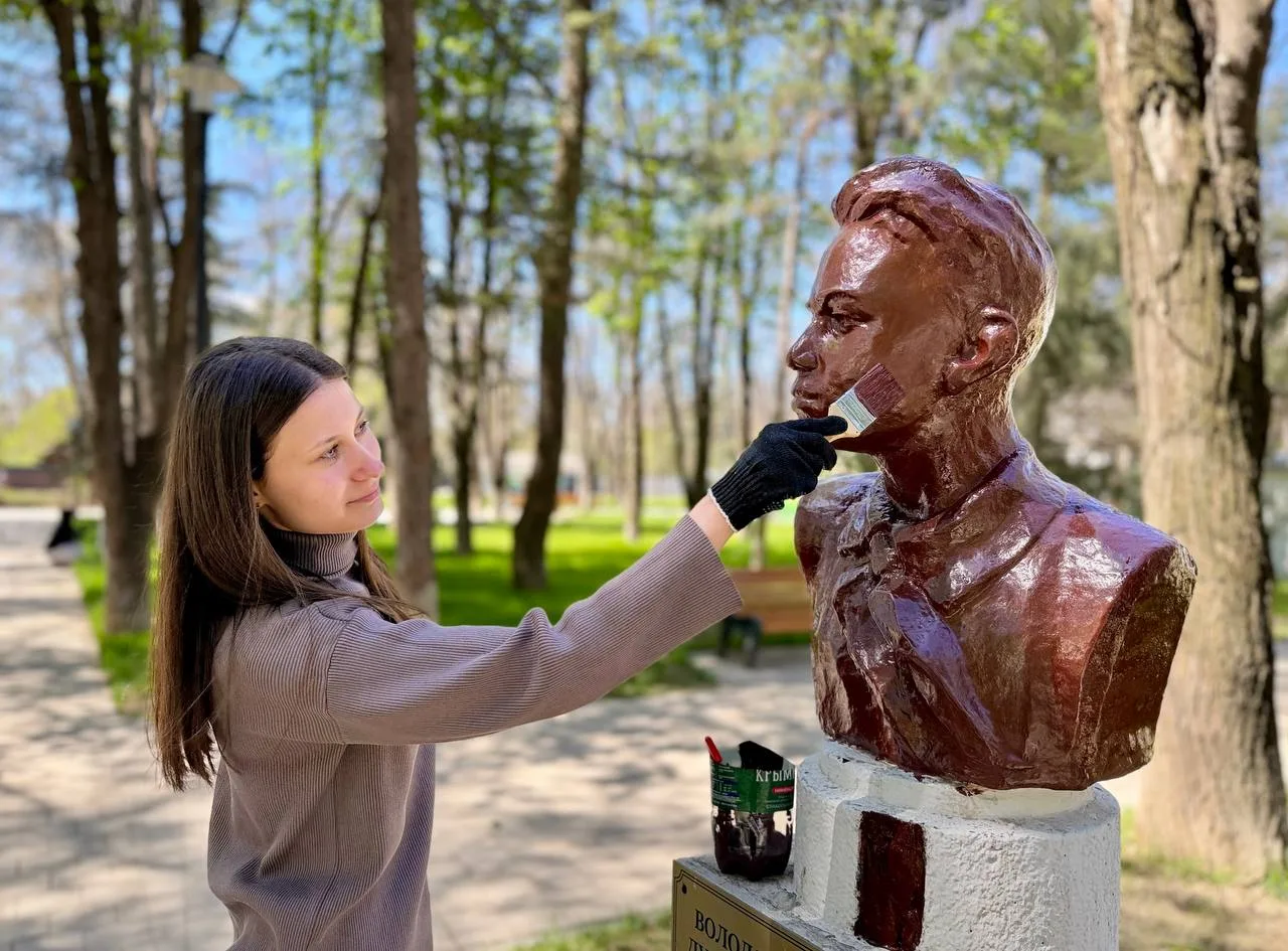 Ребята уже зачистили старую краску и тщательно загрунтовали поверхность бюстов. Следующий этап — покраска. После того как студенты закончат работу над бюстами они обновят лакокрасочное покрытие постаментов.