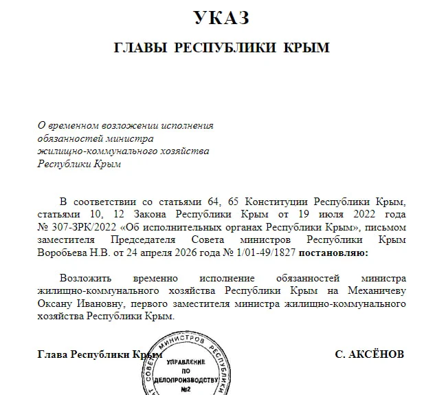 Врио министра ЖКХ Крыма стала Оксана Механичева, первый замминистра, соответствующий указ подписал Глава республики