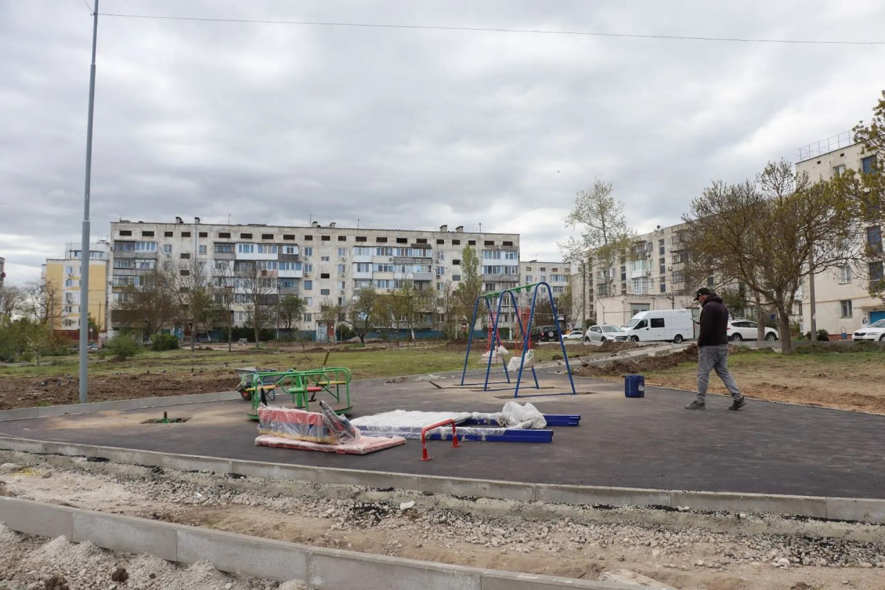 Ведется установка игровых элементов детской площадки для маленьких керчан.