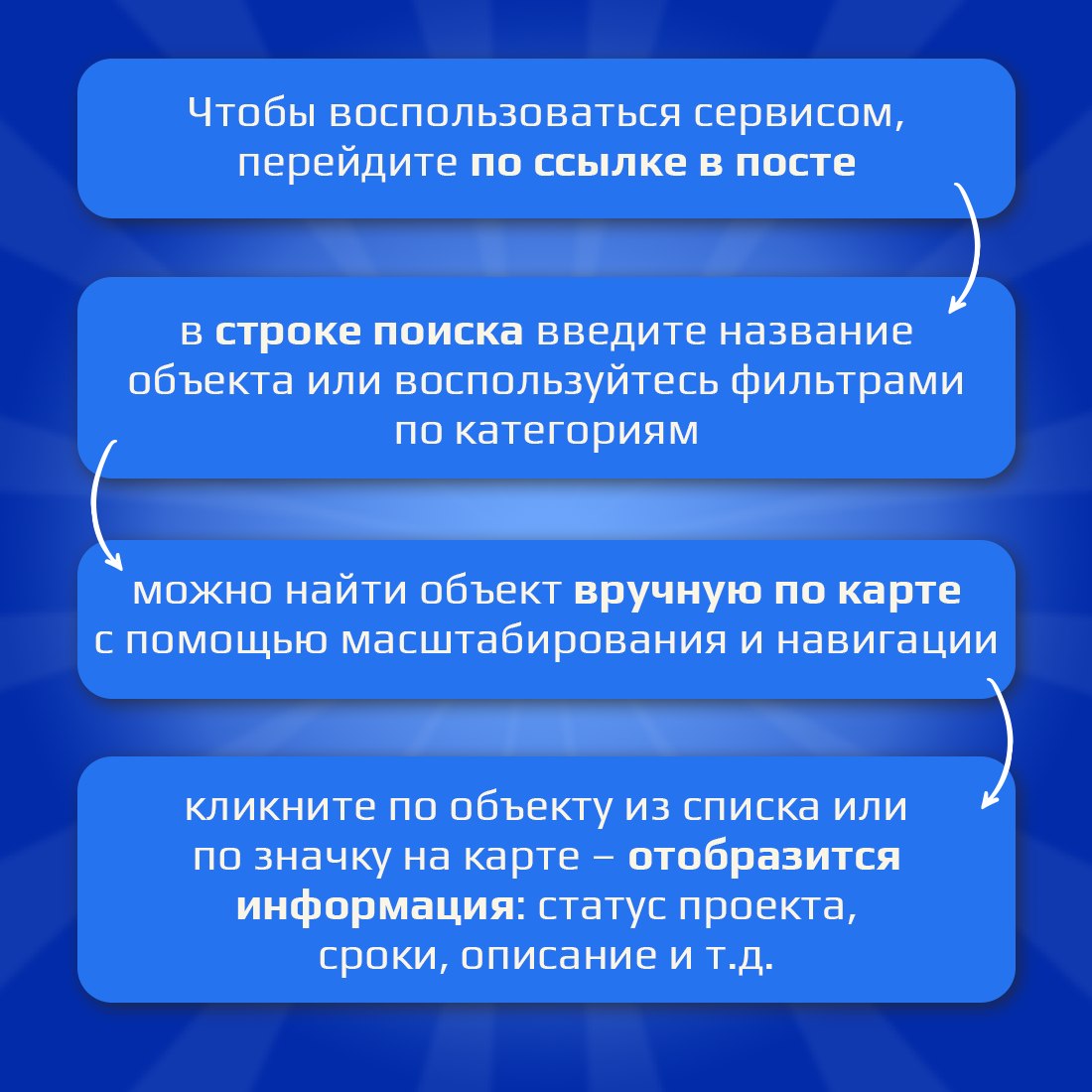 На карте можно увидеть все инфраструктурные объекты, которые строятся, ремонтируются или реставрируются. Можно узнать, какие именно работы ведутся, номер и дату контракта, сведения о заказчике и подрядчике с их телефонами. Это касается в том числе завершённых и планируемых объектов. Карта показывает их точное месторасположение и для удобства есть фильтр по категориям (остановки, дороги, социальные учреждения, объекты культурного наследия и др.).