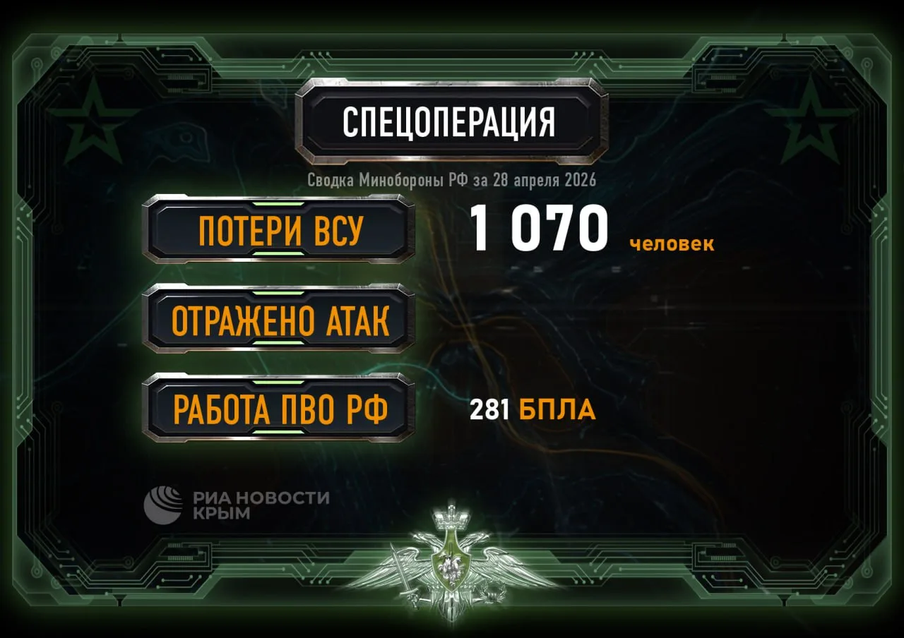 Фронтовая сводка 28 апреляНа Херсонском направлении ВС РФ уничтожили ряд огневых позиций ВСУ в с. Садовое и продолжают бить по врагу в Херсоне. Противник выпустил 39 боеприпасов по левому берегу. Данные о пострадавших уточняются.На западном фланге...