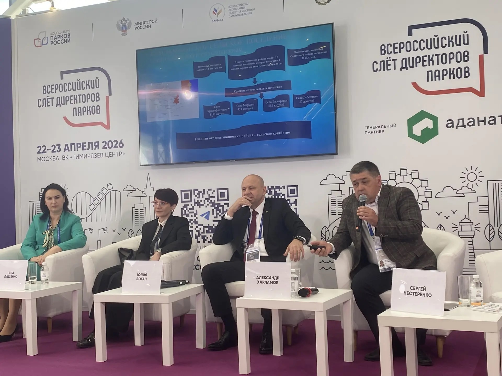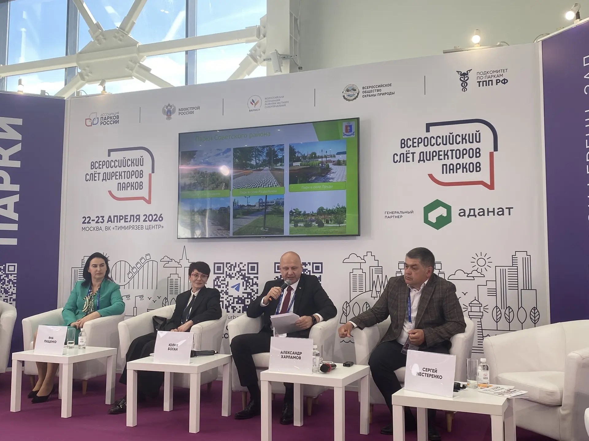 Александр Харламов и председатель Краснофлотского сельского совета Сергей Нестеренко выступили на пленарной сессии, посвящённой роли городских парков в демографической политике.