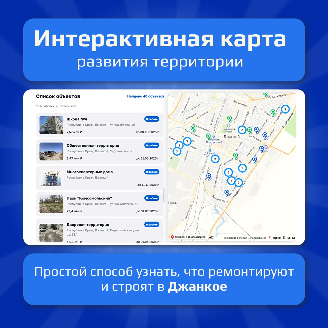 Жители Джанкоя могут самостоятельно контролировать выполнение проектов благоустройства и строительства на территории города, воспользовавшись интерактивной картой по