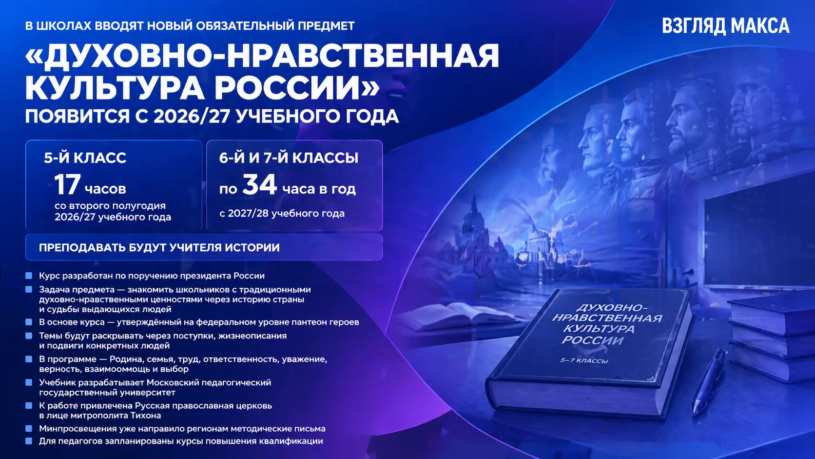 В Минпросвещения подчёркивают, что предмет разработан по поручению президента России и должен стать одним из важных мировоззренческих курсов в основной школе. Его задача — формировать у школьников представление о традиционных духовно-нравственных ценностях через историю страны, судьбы выдающихся людей, их поступки и личный пример.