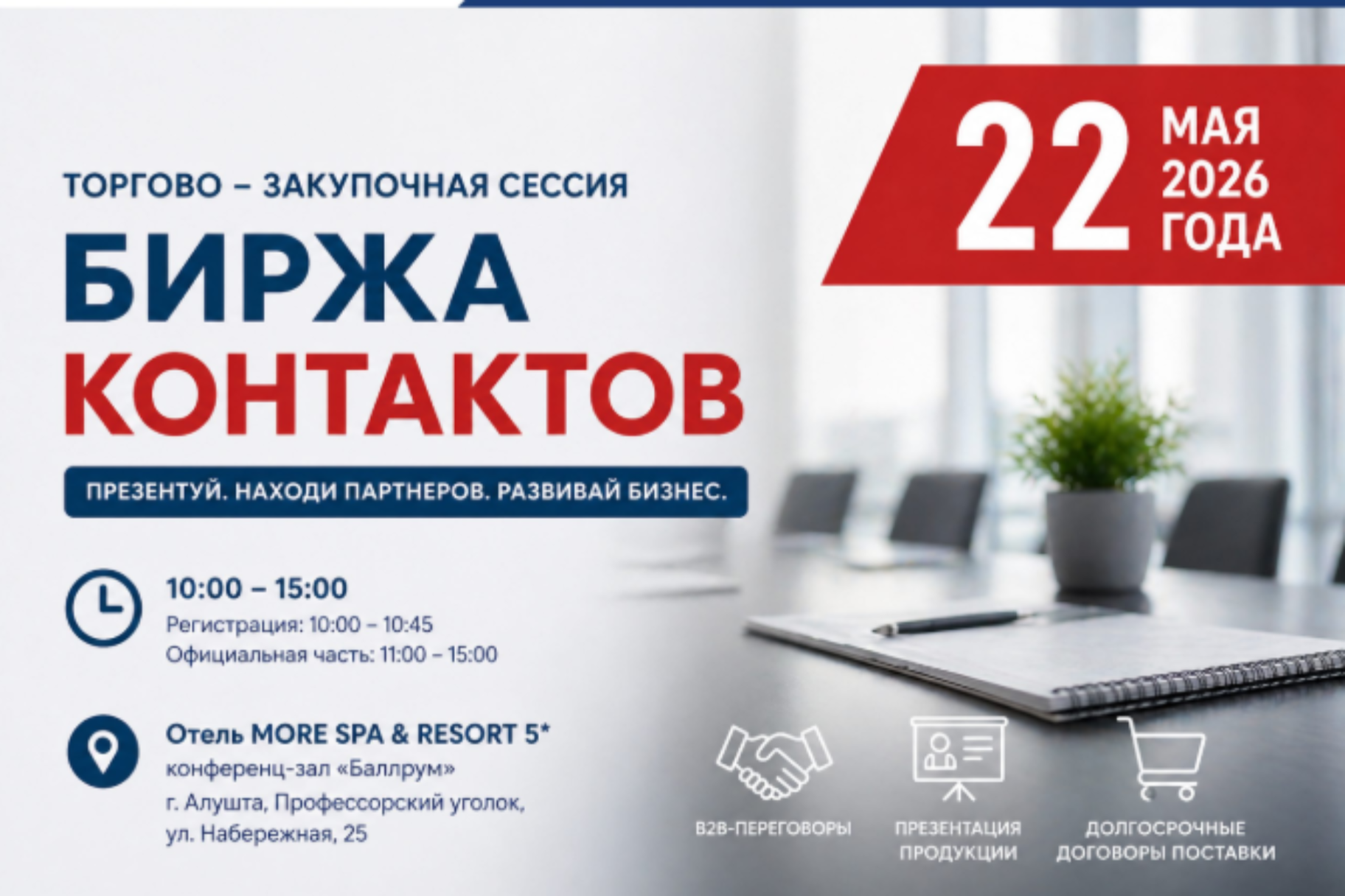 22 мая в Алуште состоится Торгово-закупочная сессия «Биржа контактов». Мероприятие проводится с 2024 года и за это время зарекомендовало себя как эффективная площадка для развития регионального бизнеса и деловых связей.