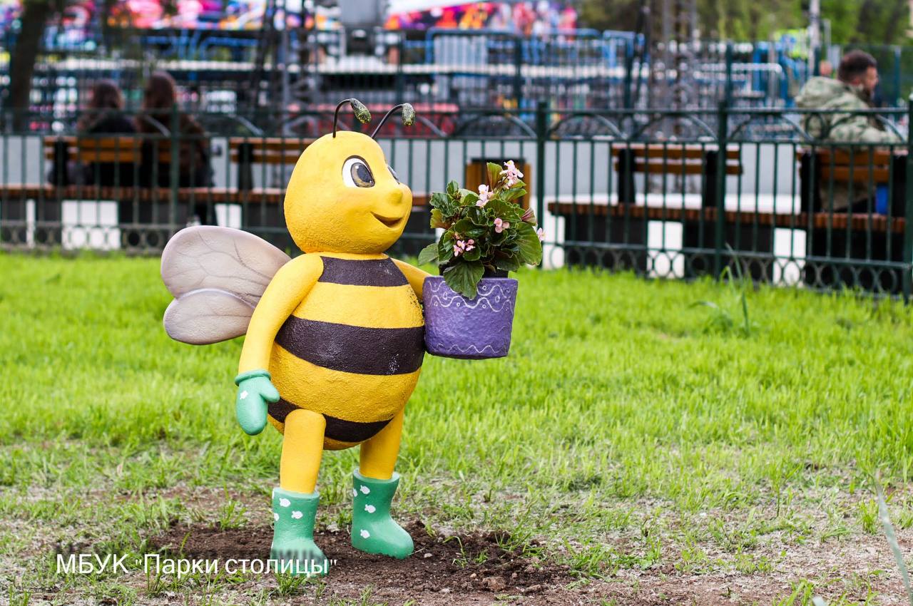 В обновлённом парке установили четыре фигуры пчёлок с сердечком, цветком, бочонком мёда и цветочным горшочком.