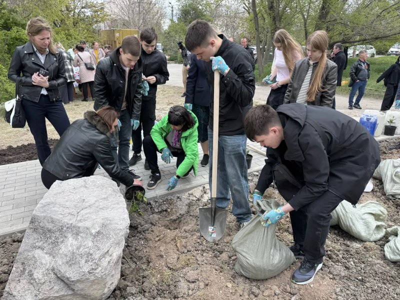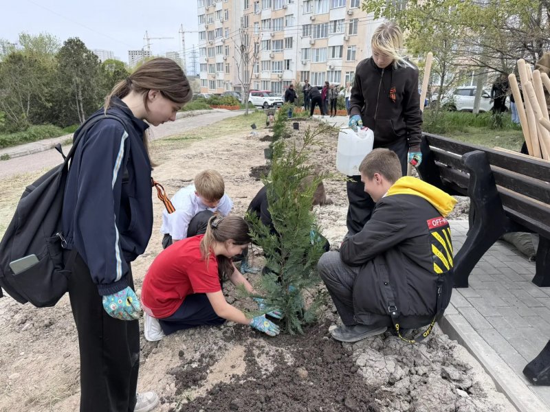 К 70-летию Дня строителя ветераны отрасли вместе со школьниками высадили почти 100 саженцев деревьев и кустарников на улице Молодых строителей. Среди них — розы, лавровишни, кипарисы и прочее.