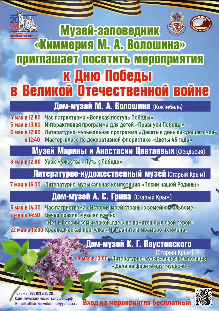 Музеи - отделы ГАУК РК «Историко-культурный, мемориальный музей-заповедник «Киммерия М. А. Волошина»»: Дом-музей М. А. Волошина, Музей Марины и Анастасии Цветаевых, Литературно-художественный музей и Дом-музей К. Г. Паустовского приглашают всех на праздничные мероприятия к Дню победы.
