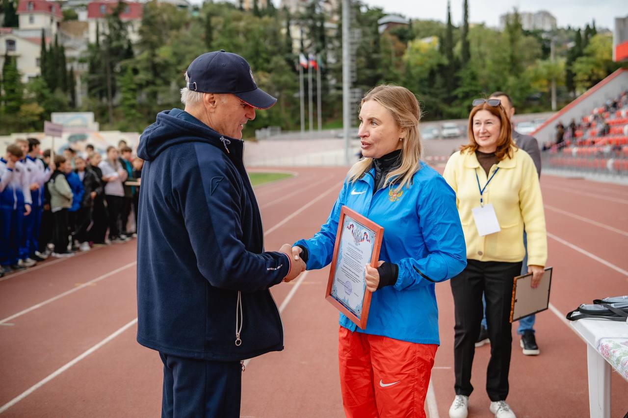 На открытии вручила благодарность Заслуженному мастеру спорта Российской федерации - Маркарян Вере Юрьевне за пропаганду здорового образа жизни, популяризацию спорта в Республике Крым и успешное выступление в Кубке России по метанию копья в г. Сочи в 2025 году.
