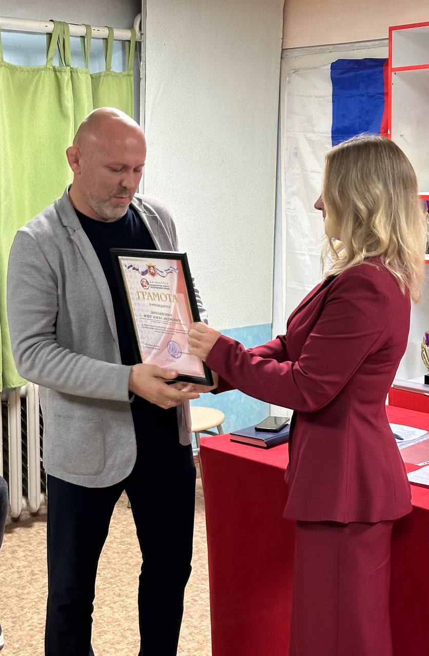 Поблагодарила за многолетний труд директора школы Домашенко Олега Александровича, вручила грамоту Министерства спорта Республики Крым. Под его руководством реализовано множество проектов, как спортивных, так и общественных. Своим профессионализмом, отношением к ветреному делу заслужил авторитет, уважение и признательность коллег и сотрудников министерства. К сожалению, по семейным обстоятельствам, вынужден покинуть руководящую должность, но остаться в коллективе. Признаюсь, это тот случай, когда жалеешь, что рабство в нашей стране давным-давно отменено. Приняла отставку директора.