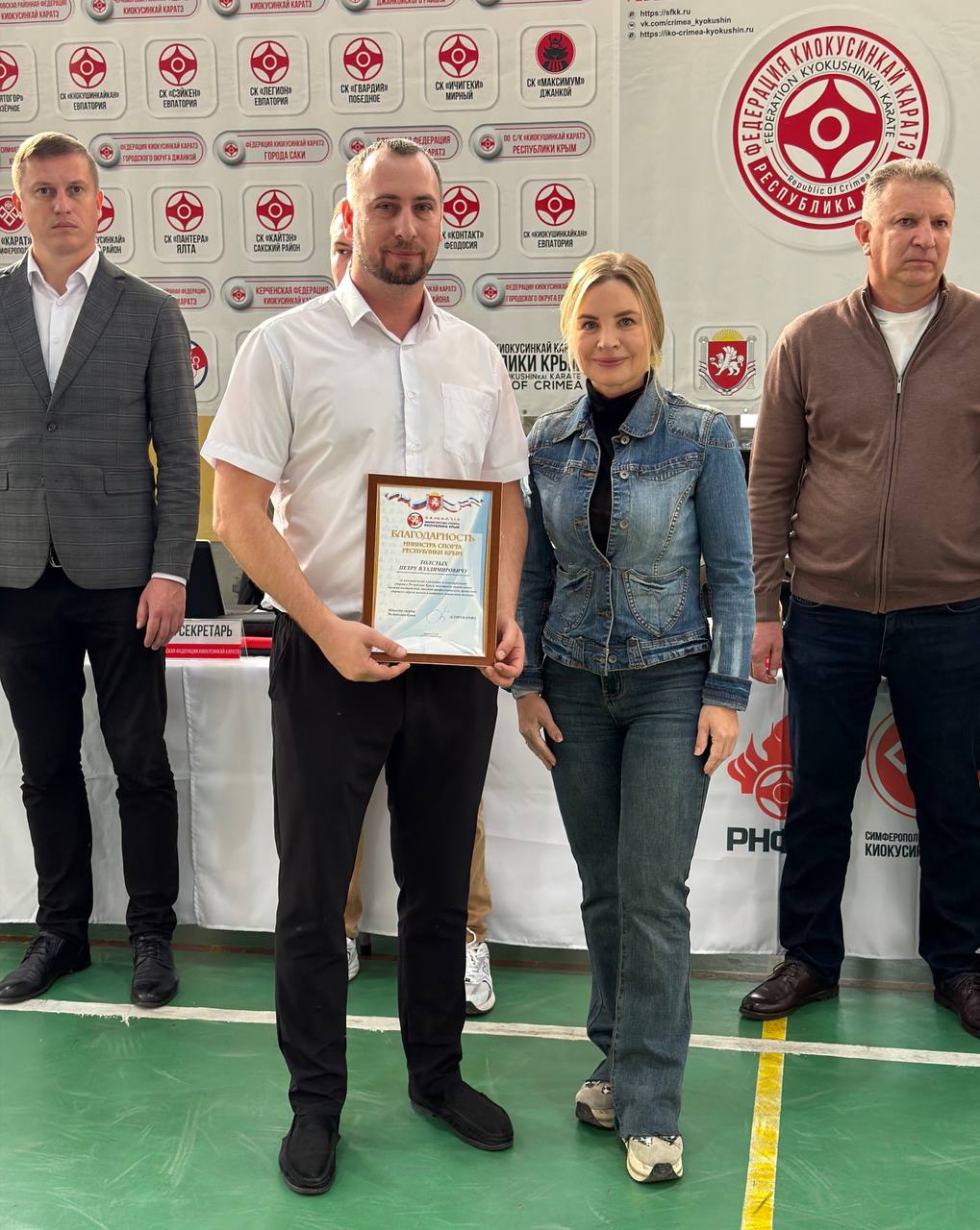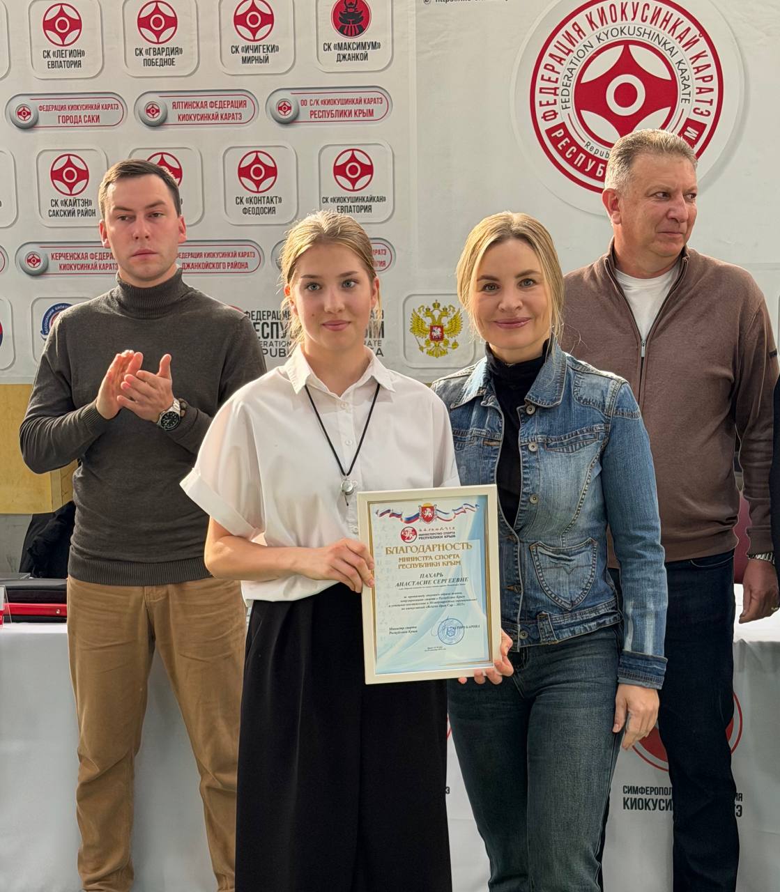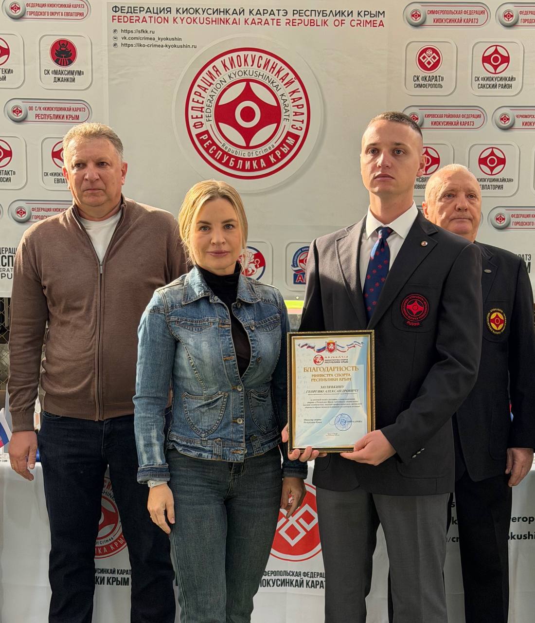 Вручила благодарности Министерства спорта Республики Крым спортсменам и тренерам сборной команды Республики Крым по Киокусинкай за успешные выступления на Международных соревнованиях среди мальчиков и девочек, юношей и девушек, юниоров и юниорок, мужчин и женщин «Belarus Open Cup - 2025», которые прошли в городе Минск (Беларусь).